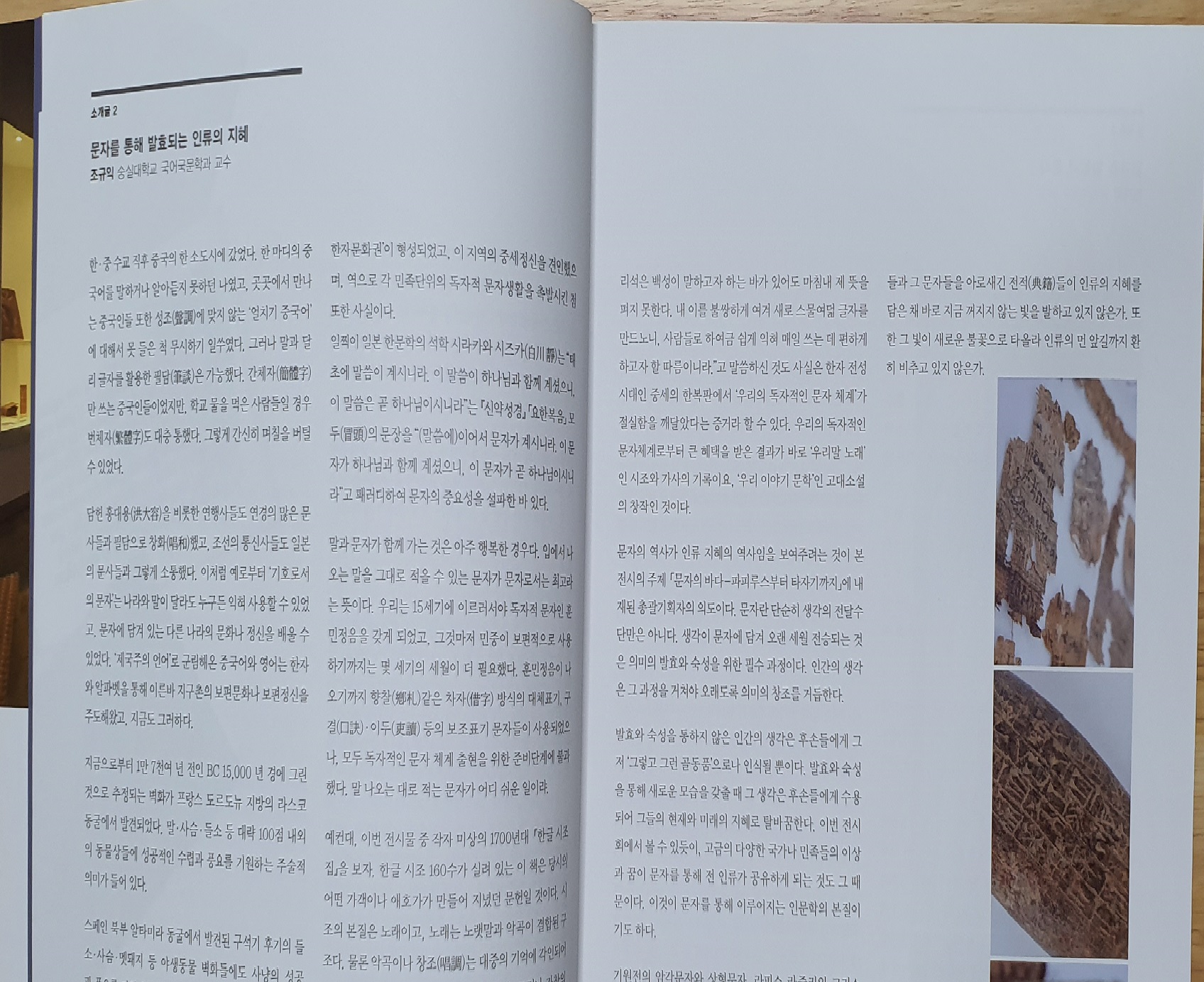 문자의 역사가 인류 지혜의 역사임을 보여주려는 것이 본 전시의 주제[‘문자의 바다-파피루스부터 타자기까지’]에 내재된 총괄기획자의 의도이다. 문자란 단순히 생각의 전달수단만은 아니다. 생각이 문자에 담겨 오랜 세월 전승되는 것은 의미의 발효와 숙성을 위한 필수 과정이다. 인간의 생각은 그 과정을 거쳐야 오래도록 의미의 창조를 거듭한다.